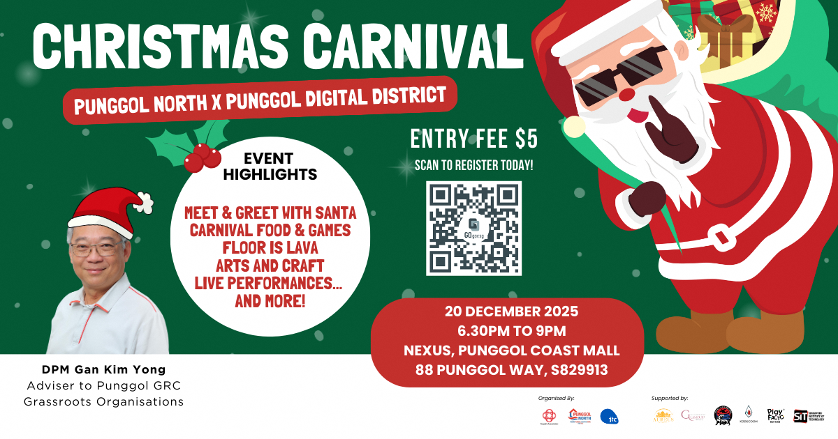 🎉 Punggol North x Punggol Digital District Christmas Carnival🎉 Celebrate the festive season at the Christmas Carnival @ Punggol Digital District! Enjoy festive bites, live performances, arts and crafts, and a special Meet & Greet with Santa. Join our ‘Spot The Santas @ PDD’ giveaway on Instagram and and redeem exclusive ‘My Punggol Story’ stickers! 👉 Admission is $5 — join us at Nexus @ Punggol Coast Mall for a festive night of fun!